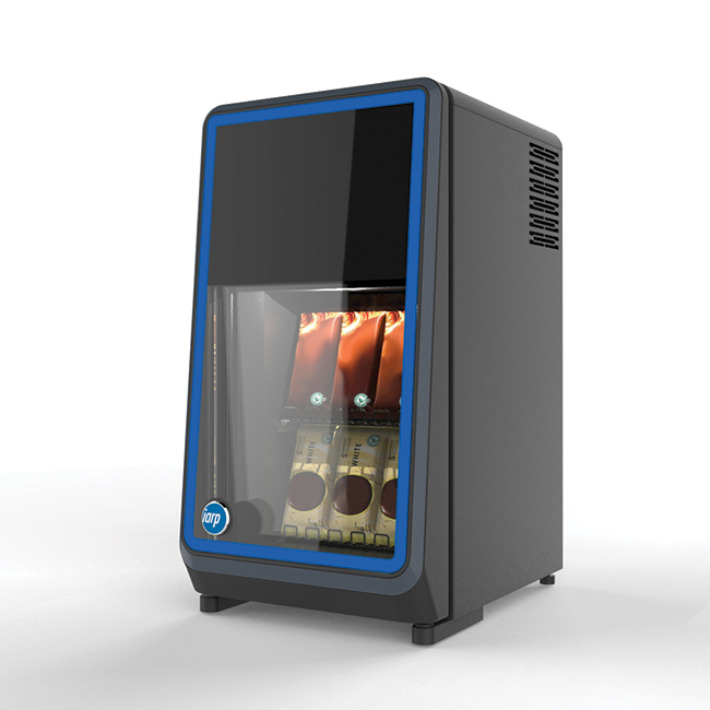 מקפיא קטן עם דלת זכוכית להנחה על דלפק. תאורה פנימית, מדף רשת שחור. יחידת קירור פנימית. צבע פנים וחוץ שחור, מסגרת הדלת כחולה. תוצרת IARP איטליה .